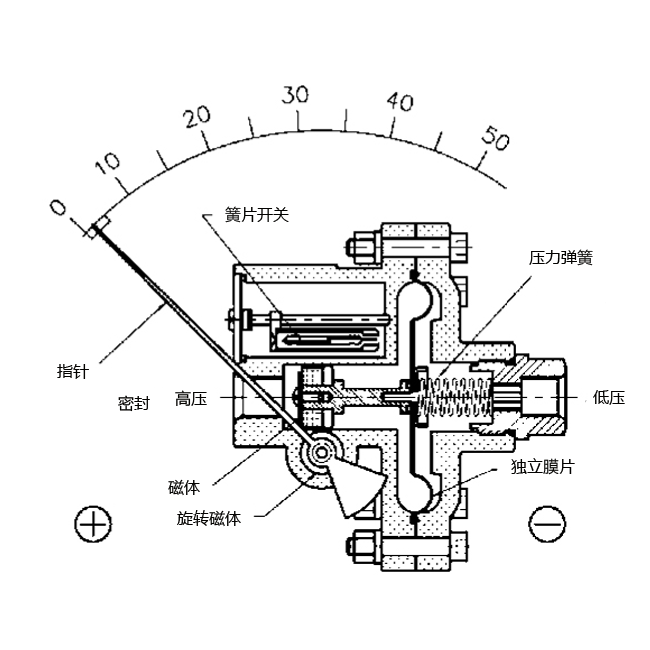 壓力作用在被膜片隔開的兩個壓力腔內。如果兩壓力腔的壓力有差異,膜片通過一個磁鐵頂著彈簧產生位移,這個位移通過裝在指針座上的電磁線圈傳遞給指針。壓差直接由指針指示。 |