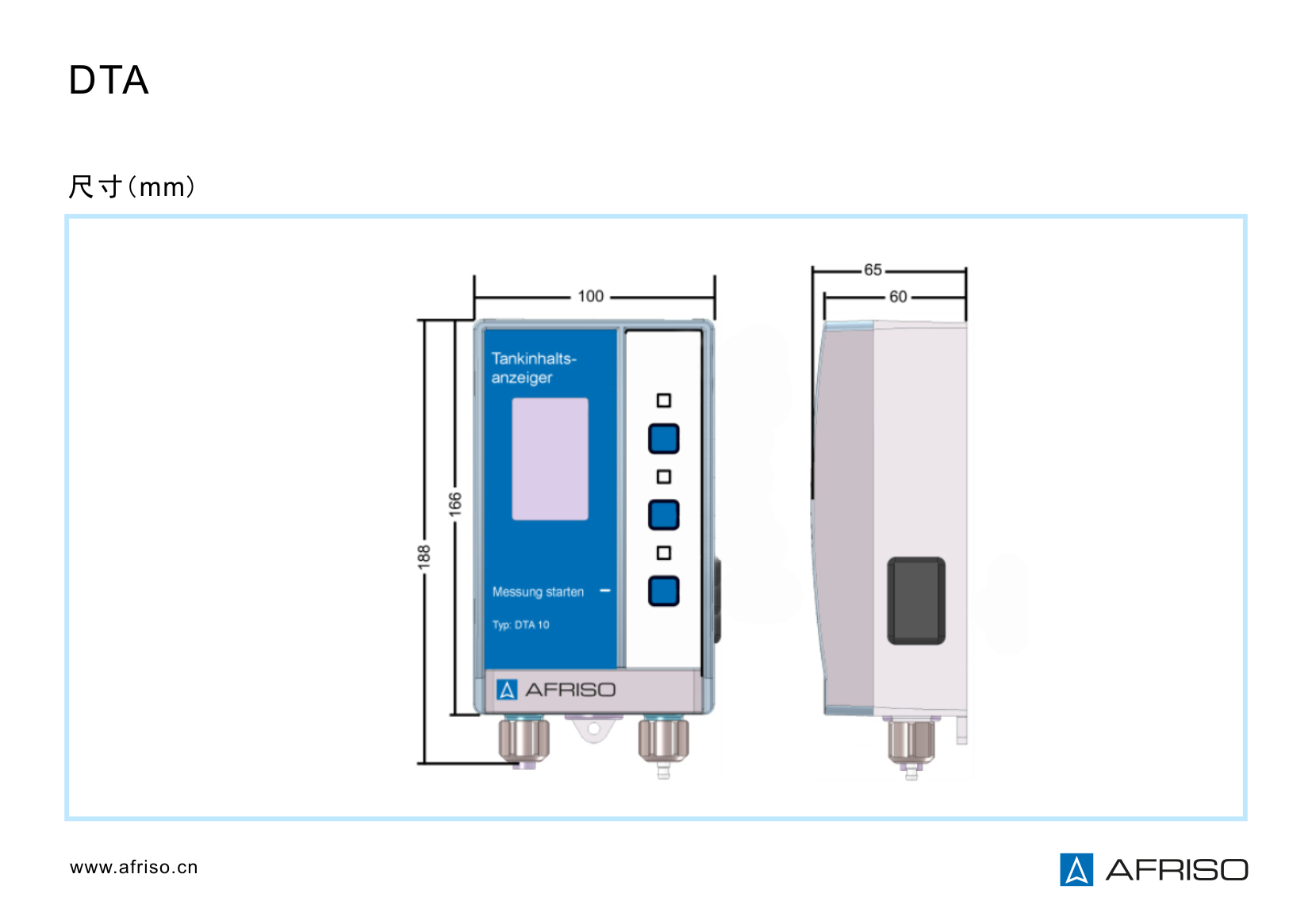 與位置無關(guān)的液位測(cè)量帶數(shù)字顯示,有最小液位信號(hào)(備用液位報(bào)警)和單一測(cè)量。適用于罐中最高不超過400cm的液位。用于燃油EL,L或柴油,F(xiàn)AME 100%作為生物柴油(EN 14214)和水(非飲用水?。?。另外,DTA 10可用于所有非腐蝕性液體的液位測(cè)量,密度為0.5至1.5 g / cm3。遠(yuǎn)程測(cè)量長(zhǎng)達(dá)15米。 |