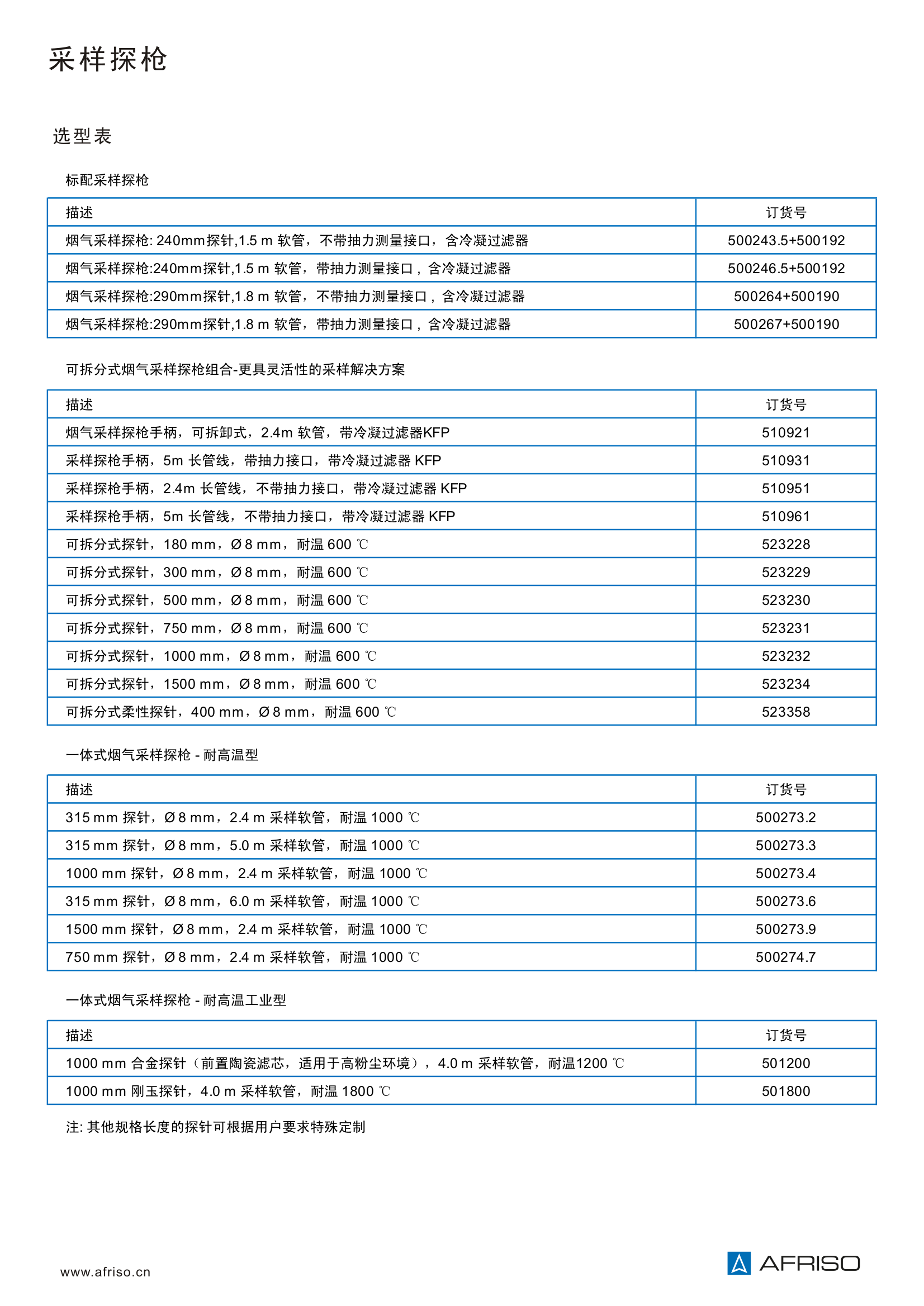 標(biāo)準(zhǔn)煙氣采樣探槍配合AFRISO煙氣分析儀使用: 根據(jù)不同的主機(jī),可分為帶抽力與不帶抽力; 探針長(zhǎng)度分240 mm和290mm; 采樣軟管分1.5 m 和1.8m; 耐溫600℃。 |