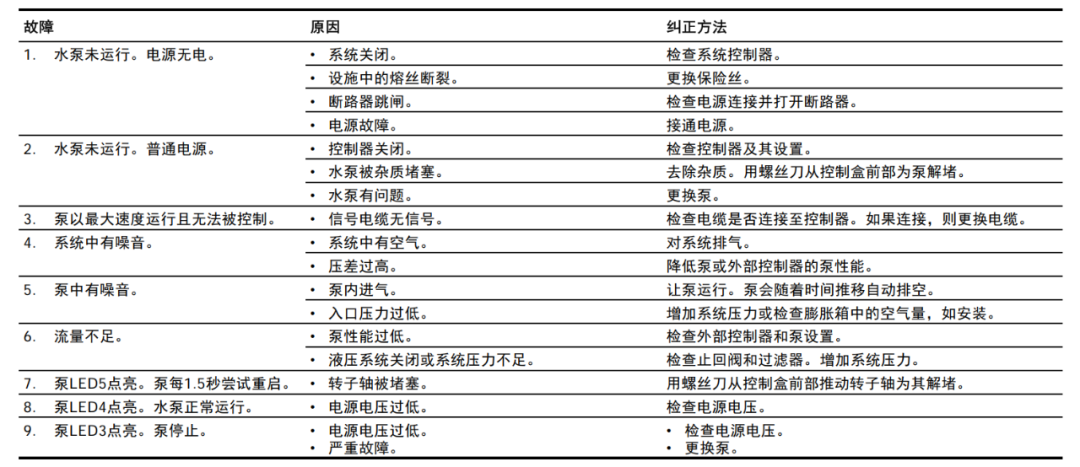 ③ 通電后,水泵是否亮紅燈報故障(參考下表,點擊可放大查看)