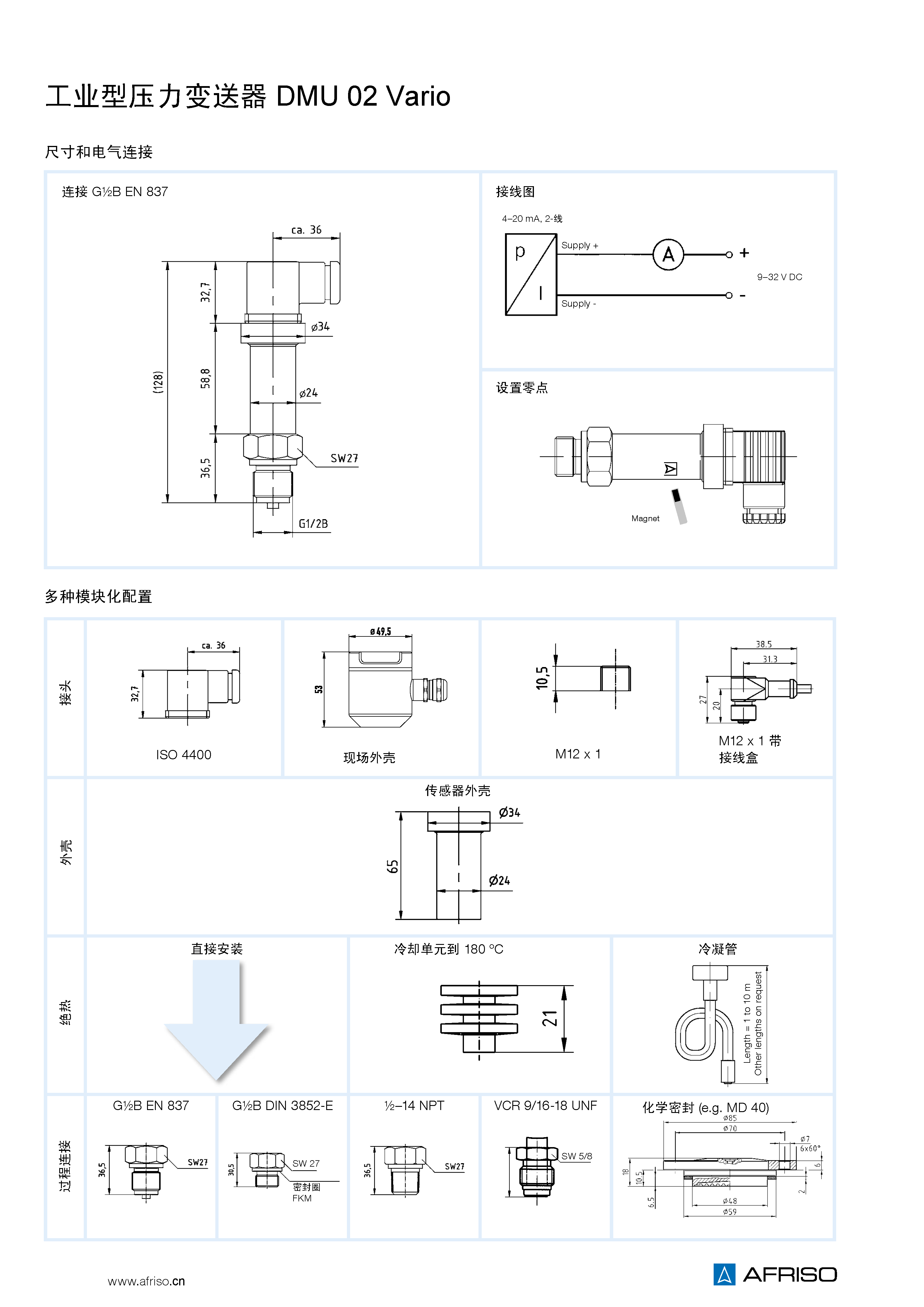 壓力變送器將物理壓力轉(zhuǎn)換成與壓力成正比的電信號。DMU 02 Vario 的測量單元是薄膜壓電多晶硅。它可配置所有標準的電氣連接方式,測量量程可通過參數(shù)設置硬件/軟件改變。通電后可用磁鐵在外面進行零位校正。 |
