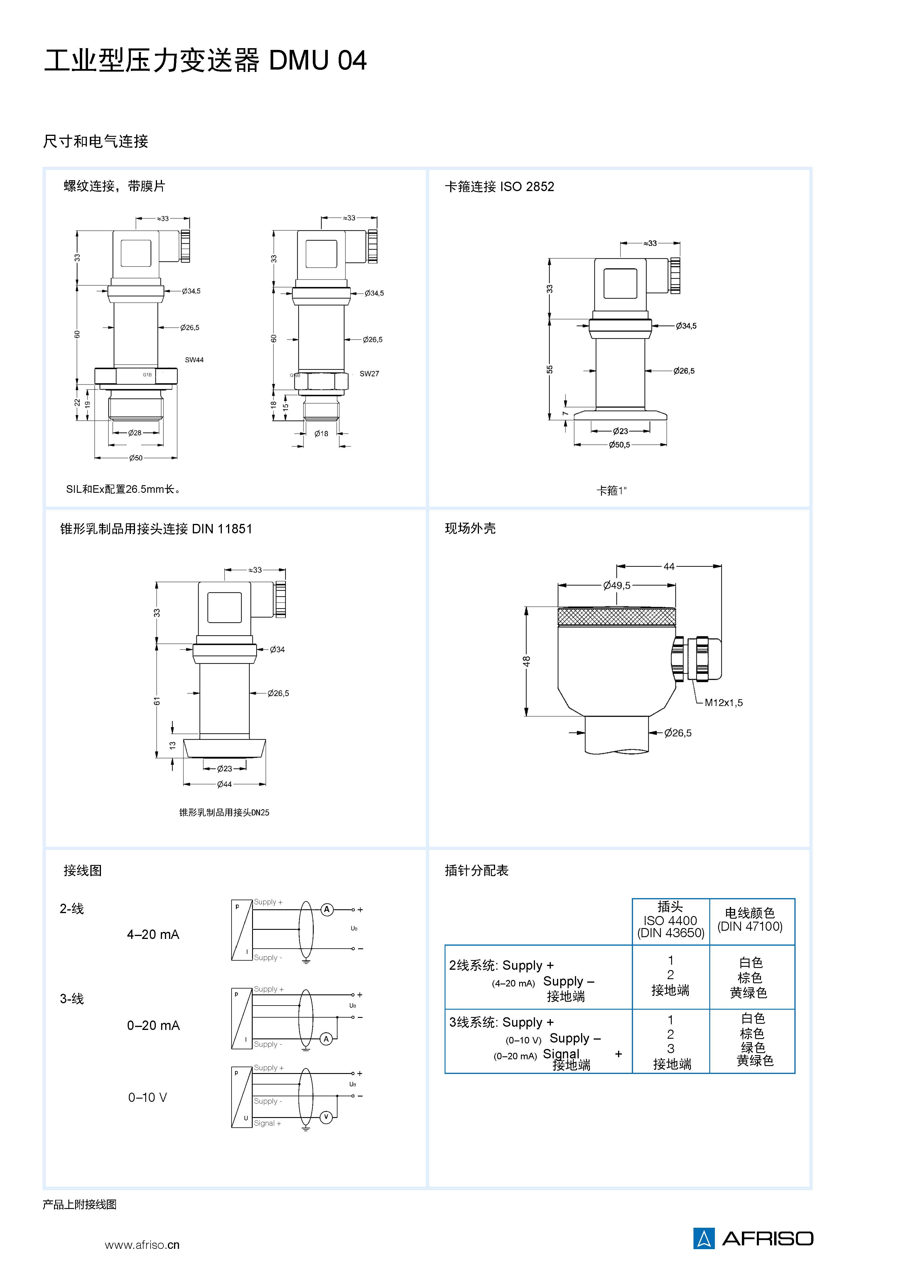 壓力變送器將物理壓力轉換成與壓力成正比的電信號。DMU 04 的測量單元是充油的壓電硅。DMU 04符合安全完整性等級SIL 2 (IEC 61508/61511) |