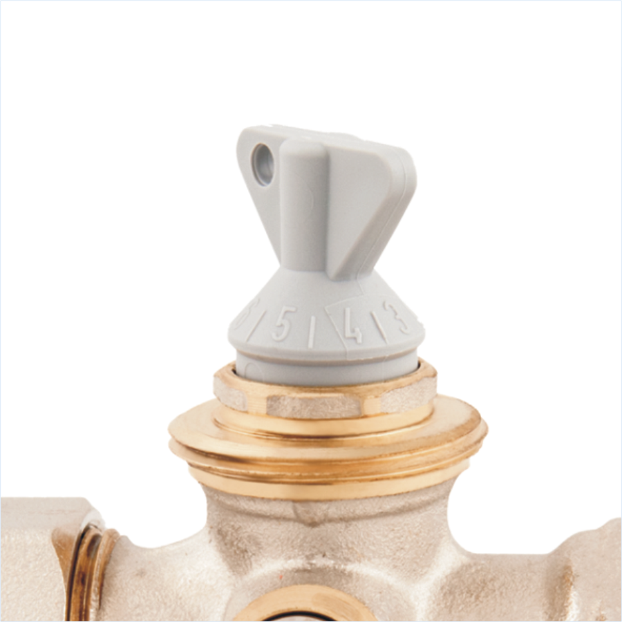 恒溫閥通過調(diào)節(jié)鑰匙ES-SV 進?手動調(diào)節(jié)。用調(diào)節(jié)鑰匙旋轉(zhuǎn)閥芯, 調(diào)節(jié)鑰匙有刻度1~8,將刻度8 對齊參考點( 如右圖)。 從刻度8 開始調(diào)節(jié)(8= 全開),每轉(zhuǎn)1/8圈對應(yīng)一個流量特性。