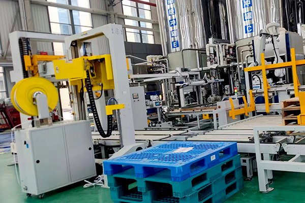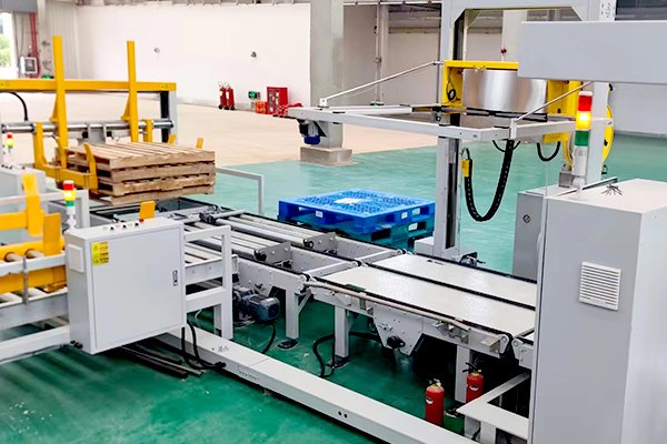 油桶碼垛線是區(qū)別于紙箱與袋碼垛方式的不同碼垛形式,該線體主要由供棧機(jī)、桁架碼垛機(jī)、油桶定位和旋轉(zhuǎn)裝置以及托盤捆扎機(jī)組合而成,油桶定位和旋轉(zhuǎn)裝置可以將桶輸送到指定位置,并按照指定要求,將桶的標(biāo)志面都朝向托盤外側(cè),方便讀取信息。同時(shí)配以桁架式碼垛機(jī),將1-2桶物料抓取平移后,碼到指定托盤上。