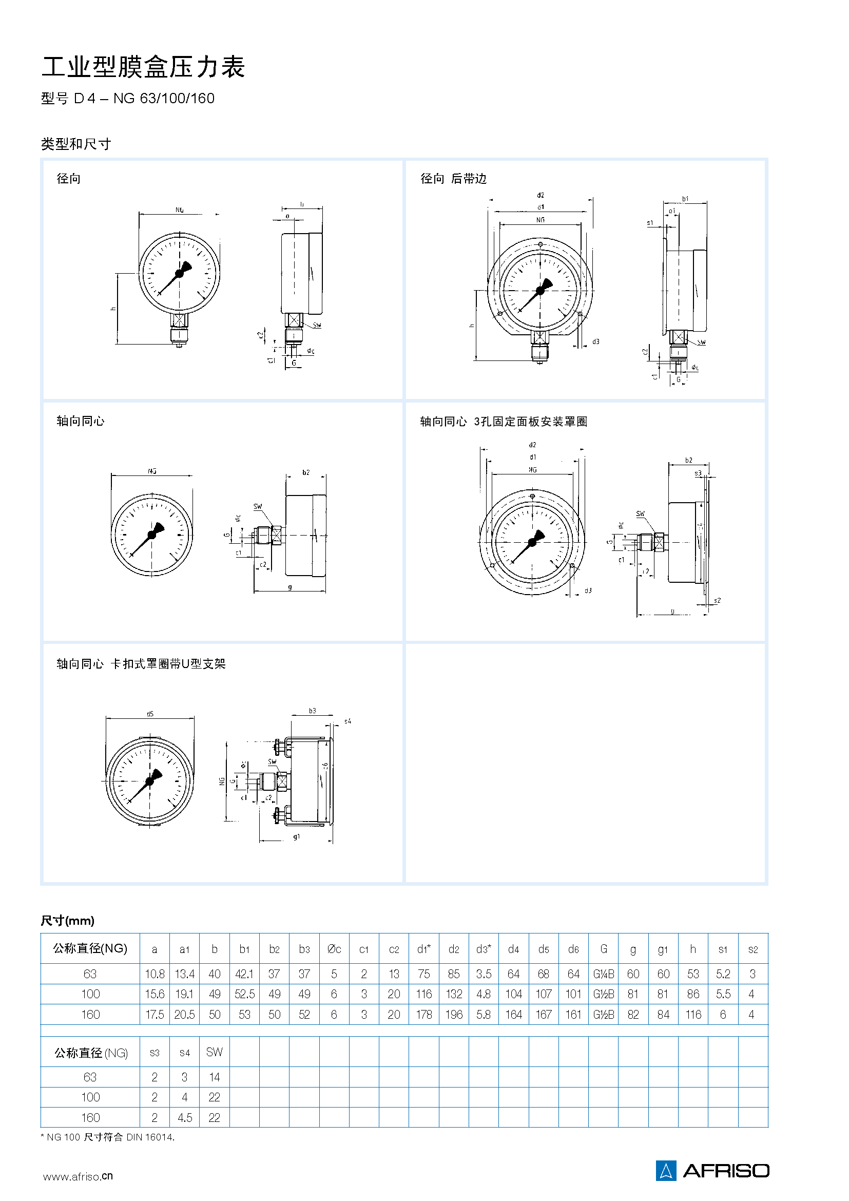 銅合金,徑向或軸向同心 NG 63 G1/4B – SW14 NG 100-160 G1/2B – SW22 (EN 837-3/7.3) |