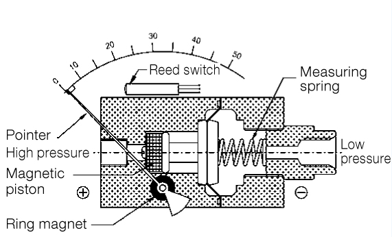 壓力作用在被電磁活塞和額外的隔離膜片隔開的兩個(gè)壓力腔內(nèi)。如果兩壓力腔的壓力有差異,電磁活塞就會(huì)頂著彈簧產(chǎn)生位移,電磁線圈將這個(gè)位移通過裝在指針座上的電磁線圈傳遞給指針。壓差直接由指針指示。 |